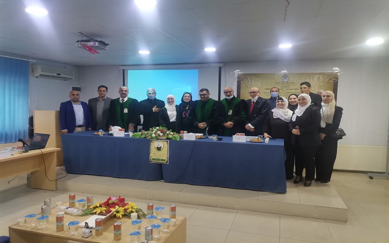 وتألفت لجنة المناقشة من الدكتور حمزة الحوامدة مشرفا ورئيسا ، والأستاذ الدكتور محمود الروسان رئيس جامعة عجلون الوطنية