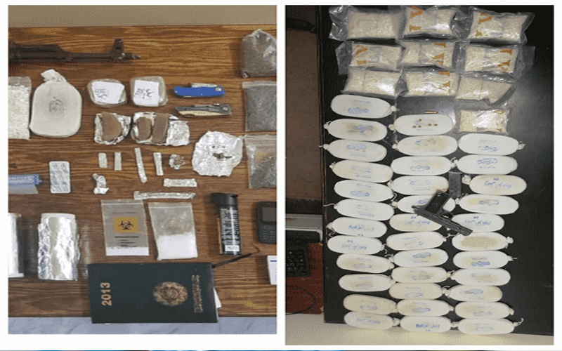 ففي القضية الأولى وبعد جمع المعلومات حول قيام أحد الأشخاص بالاتجار وترويج المواد المخدرة في البادية الشمالية، إذ تمت مداهمته وإلقاء القبض عليه وضُبط بحوزته 35 كف حشيش و 12 الف حبة كبتاجون مخدرة بالإضافة الى سلاح ناري.