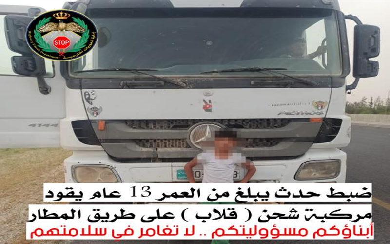 نيسان ـ ضبطت كوادر الدوريات الخارجية العاملة على طريق المطار، اليوم السبت، حدثا يبلغ من العمر 13 عاما يقود مركبة شحن "قلاب".
