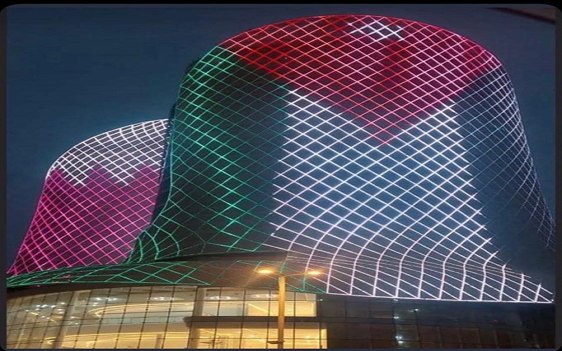 مبنى فندق شيراتون الدوحة الفندق الرسمي للدولة، وأيقونة أبراج ومبان الدوحة، وأعرقها وأقدمها، توشح بالعلم الاردني.