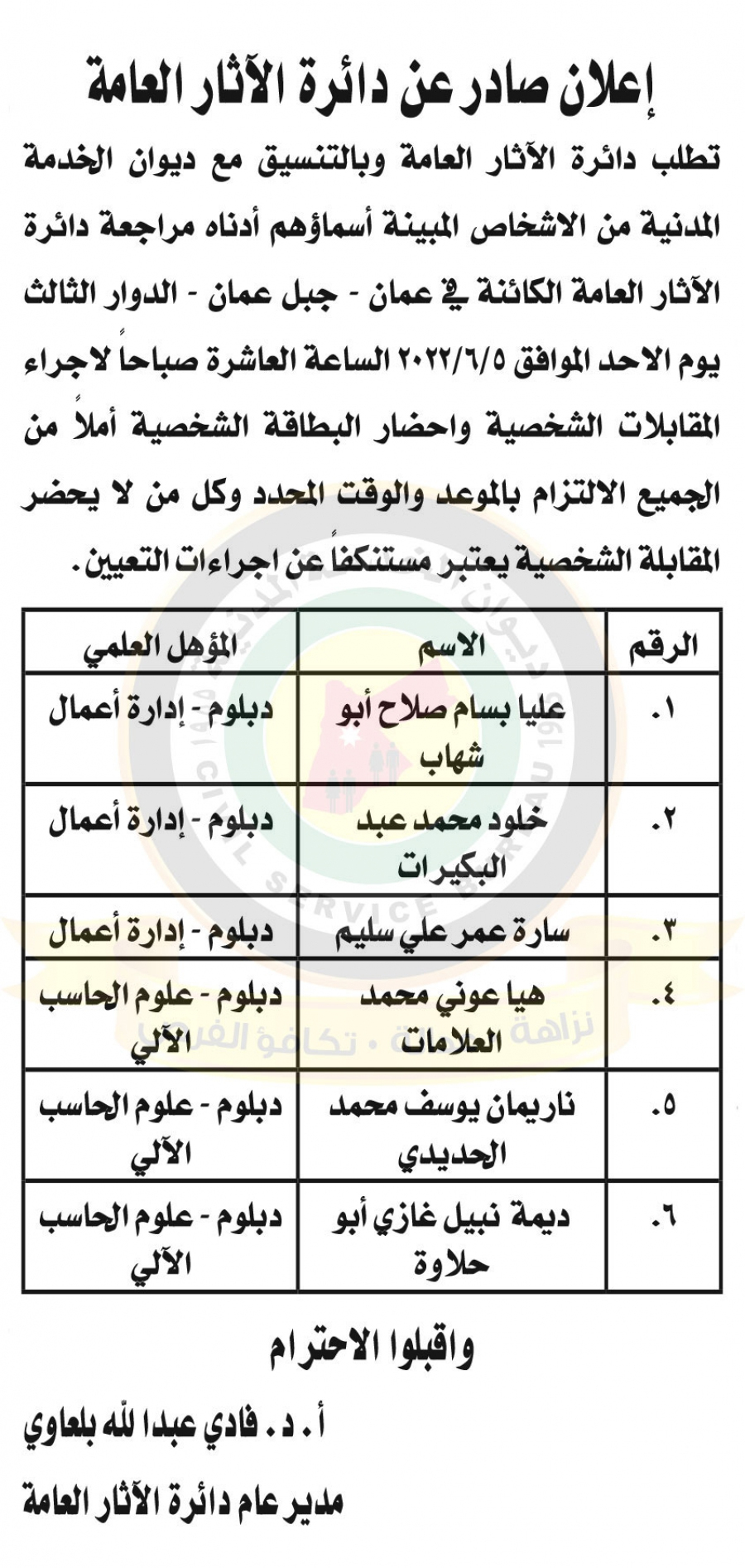 نيسان ـ طلبت دائرة الآثار العامة وبالتنسيق مع ديوان الخدمة المدنية من الاشخاص المبينة أسماؤهم مراجعة مبنى دائرة الآثار العامة لاجراء المقابلات الشخصية .