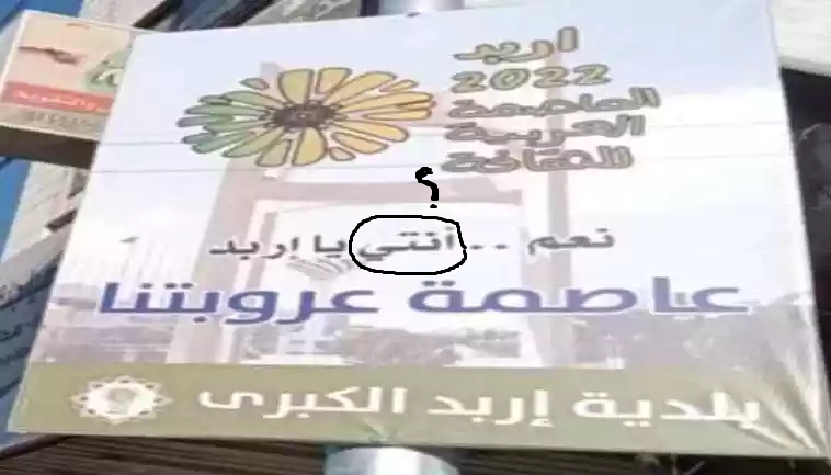 نيسان ـ سحبت بلدية إربد الكبرى، يافطات تم تركيبها في مواقع ومعالم المدينة، وذلك بسبب خطأ لغوي ظهر بإعلان لمدينة إربد عاصمة للثقافة العربية، وتمثل الخطأ الذي ظهر في اللافتة بكتابة كلمة "انتي" فيما الصحيح لغويا كتابتها "أنتِ".