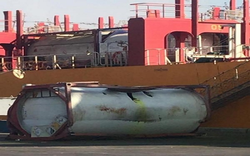 نيسان ـ قال الناطق الاعلامي باسم مديرية الامن العام إنه وأثناء الأعمال اليومية في ميناء العقبة اليوم، وقعت حادثة سقوط لصهريج معبأ بمادة غازية سامة أثناء نقله مما أدى الى تسرب الغاز في الموقع.