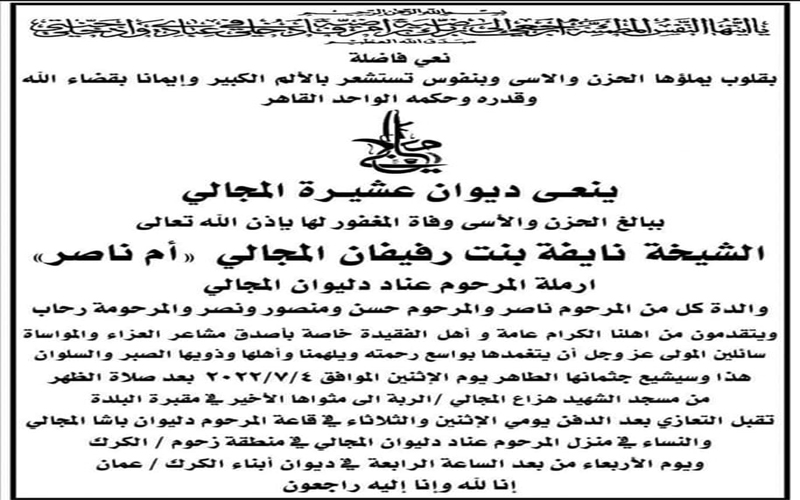 والفقيدة شقيقة المشير الراحل حابس المجالي وزوجة الشيخ الراحل عناد المجالي وابنة الزعيم الراحل ارفيفان المجالي ورائدة العمل النسوي والخيري والاجتماعي في الأردن بشكل عام والكرك بشكل خاص.