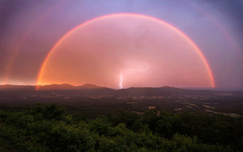 وكانت النتيجة عبارة عن صورة حالمة حيث يبدو قوس القزح المزدوج وكأنّه إطار طبيعي لصاعقة البرق.