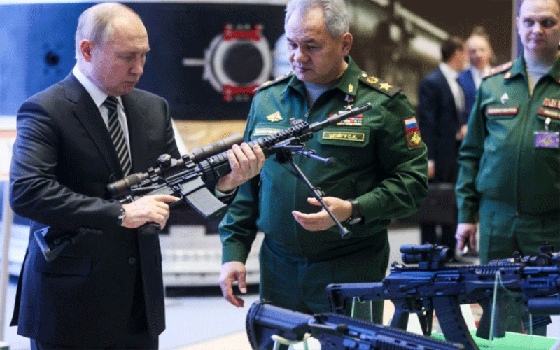 الرئيس الروسي فلاديمير بوتين يمسك سلاحاً نارياً ويقف بجواره وزير دفاعه سيرغي شويغو/رويترز