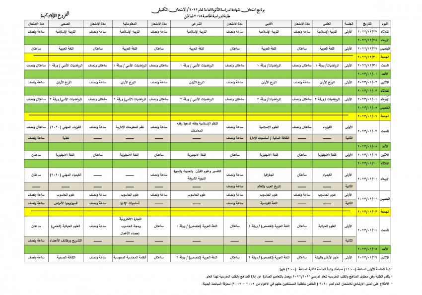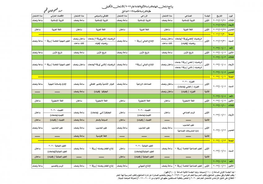 وسيكون أول أيام الامتحان الثلاثاء الموافق 27 كانون الأول 2022، وآخر أيام الامتحان الاثنين 16 كانون الثاني 2023.