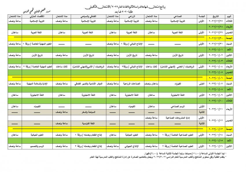 نيسان ـ أعلنت وزارة التربية والتعليم اليوم الأحد جدول امتحان شهادة الدراسة الثانوية العامة لعام 2022 / الامتحان التكميلي.