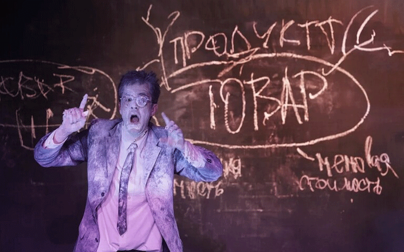 ويعتمد العرض في جوهره وطبيعته، فيما يبدو من الوهلة الأولى، على التلقين، على الممثل المرشح لجائزة القناع الذهبي ألكسندر نيكولاييف الذي يرسم لنا على "سبّورة" شرحا مبسطا لـ "رأس المال"، وكأنما يجيب على أسئلة "الطلبة/الجمهور"، إلا أننا نخرج من المسرحية، بأسئلة أكثر من الأجوبة، أسئلة نطرحها على أنفسنا قبل أي أحد آخر حول الثقافة الاستهلاكية، العولمة، غياب الحدود بين الدول والثقافات على شبكة الإنترنت ومواقع التواصل الاجتماعي، حول العالم الجديد، وربما "النظام العالمي الجديد"، و"الأيديولوجية" الجديدة التي يجب علينا البحث عنها لإنقاذ العالم.