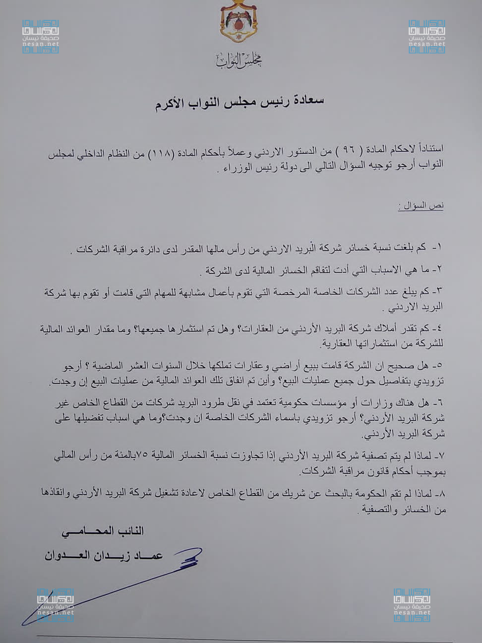نيسان ـ وجه النائب المحامي عماد زيدان العدوان سؤالا نيابيا لرئيس الوزراء حول شركة البريد الأردني والخسائر التي لحقت بها ما يعرضها لاحتمالية للتصفية بحسب قانون دائرة مراقبة الشركات.