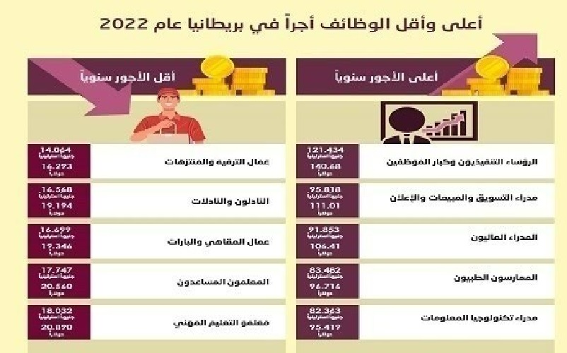 ﺃﻋﻠﻰ ﻭﺃﻗﻞ ﺍﻟﻮﻇﺎﺋﻒ ﺃﺟﺭﺍً ﻓﻲ ﺑﺮﻳﻄﺎﻧﻴﺎ ﻋﺎﻡ 2022