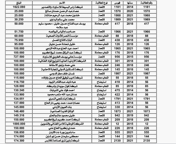 وقالت الجمارك في مطالبتها المنشورة بالجريدة الرسمية بتاريخ 2022/12/15، إنه تحققت بذمة المذكورين المبالغ المبينة إزاء كل اسم منهم وذلك فرق في الرسوم الجمركية والضريبة العامة والخاصة على المبيعات والضرائب والرسوم الأخرى نتيجة للتدقيق اللاحق سندا لأحكام المادة (245/أ) من قانون الجمارك رقم (20) لسنة 1998 وتعديلاته.