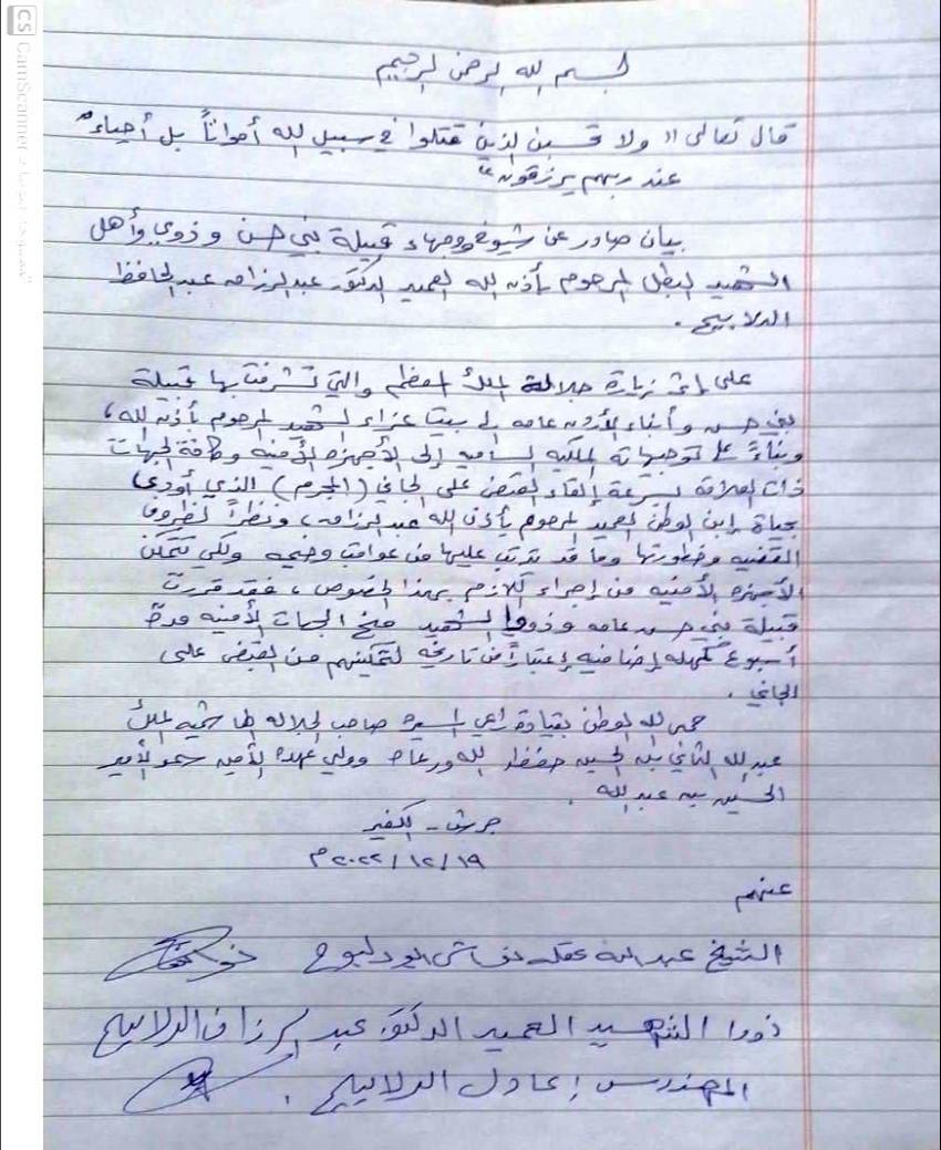 قبيلة بني حسن تمدد مهلة القبض على قاتل الشهيد الدلابيح أسبوعا