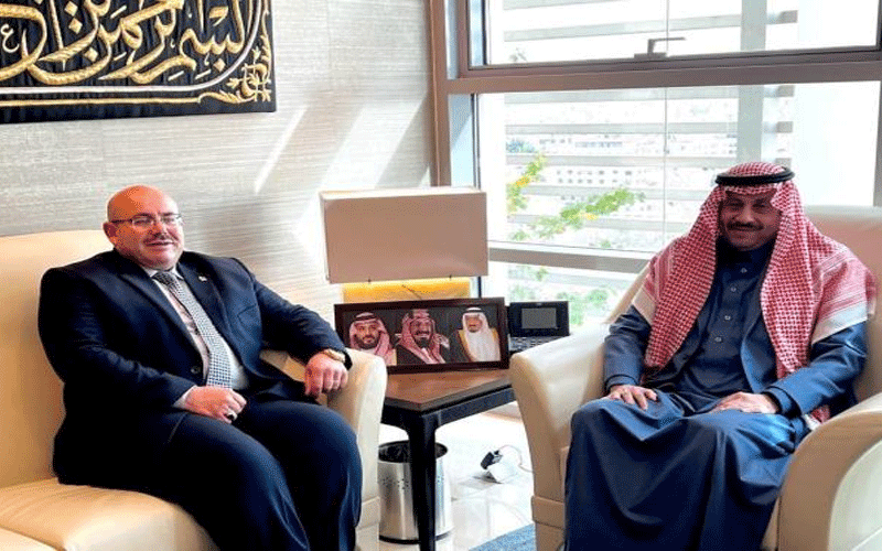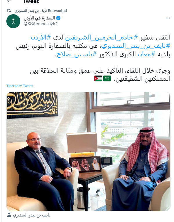 نيسان ـ التقى السفير السعودي في عمان نايف بن بندر السديري، في مكتبه بالسفارة اليوم، رئيس بلدية معان الكبرى الدكتور ياسين صلاح.