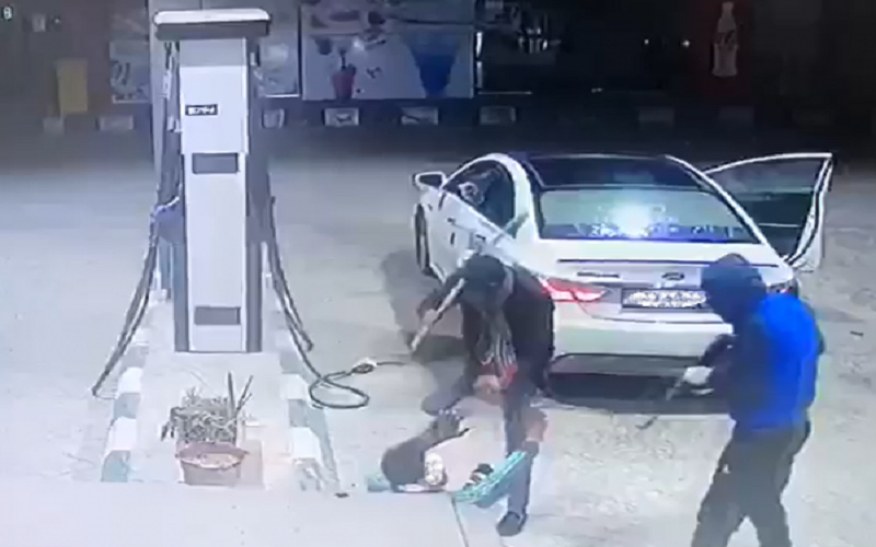 وكشف مقطع فيديو عن الاعتداء على عامل المحطة وضربه بعصى واشهار سلاح ناري في وجهه، ثم سلب ما معه من أموال، بعد أن زود المركبتهما بالمحروقات.