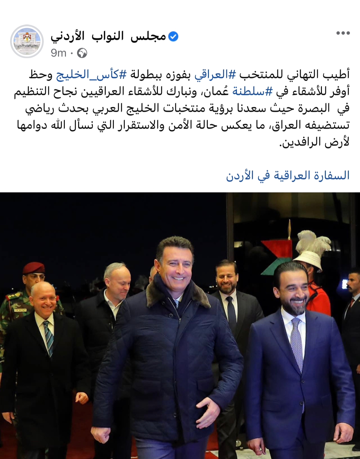 نيسان ـ وجه رئيس مجلس النواب أحمد الصفدي التهنئة للأشقاء في العراق بمناسبة فوز منتخب بلادهم ببطولة كأس الخليج.