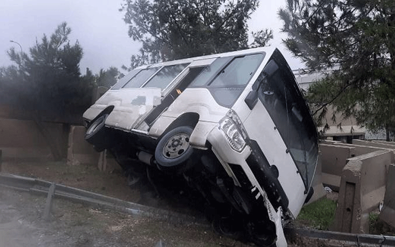 نيسان ـ أصيب شخصان صباح اليوم السبت إثر حادث تدهور وانقلاب ( باص متوسط ) يتبع لإحدى الشركات الخاصة، بالقرب من نهاية شارع الامير حسين باتجاه بداية طريق المطار .
