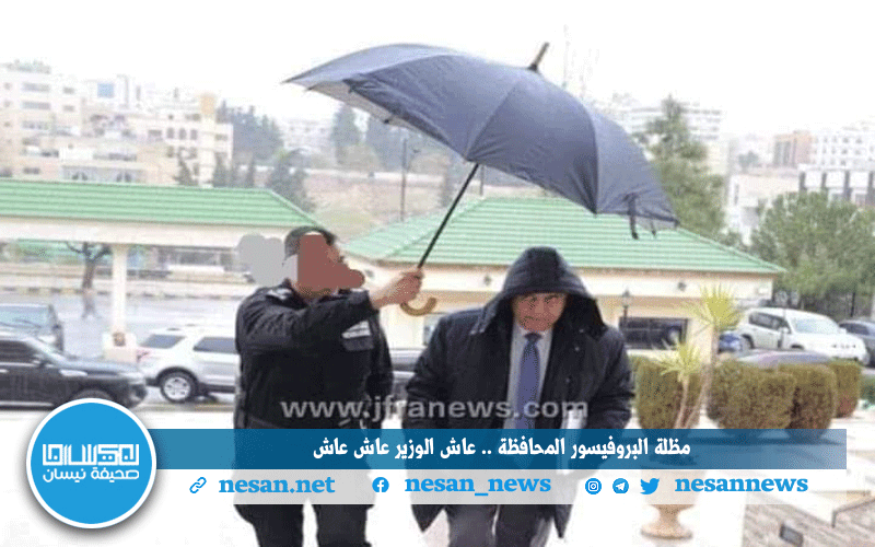 في الصورة، يحمل ضابط من مرتبات الامن العام مظلة الوزير، بينما ينظر الوزير محافظة للأفق، ويضع يده اليمنى في جيبه فيما تحمل اليسرى أوراقاً يبدو أنها غاية في الأهمية.
