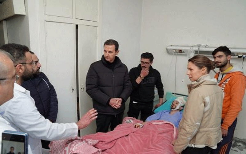 إلى ذلك تفقد الأسد وعقيلته أمس الجمعة، أوضاع المتضررين جراء الزلزال في محافظة حلب وعمليات الإنقاذ المستمرة في عدة مناطق.