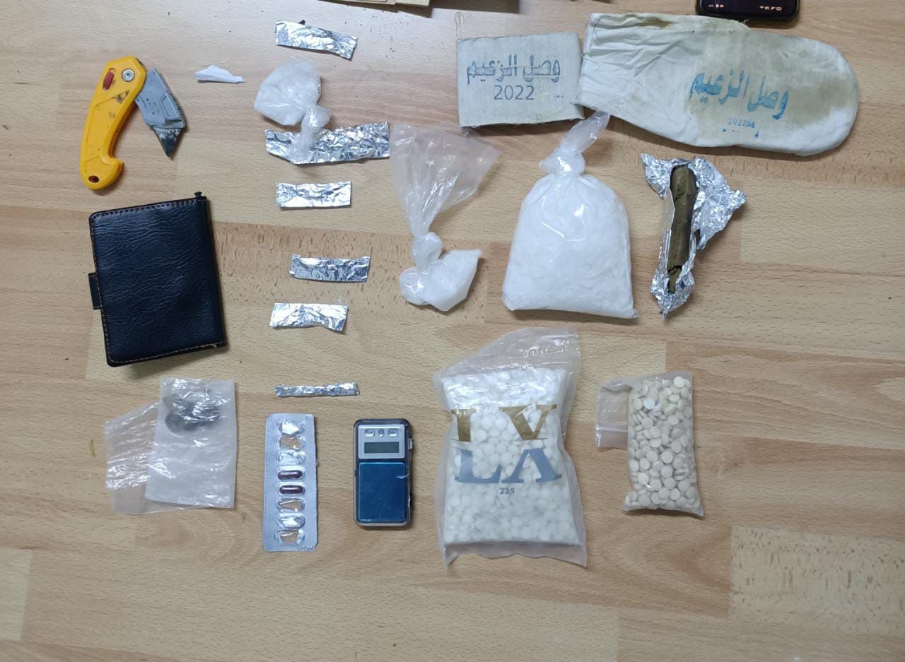 فيما جرت في محافظة المفرق مداهمة احد تجار المخدرات داخل مركبته والقي القبض عليه بعد أنْ ابدى مقاومة للقوة وضبط بحوزته 1500 حبة مخدرة وكف ونصف من الحشيش وكمية من مادة الكريستال المخدرة .