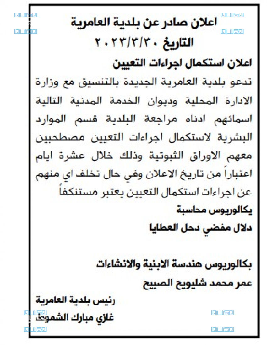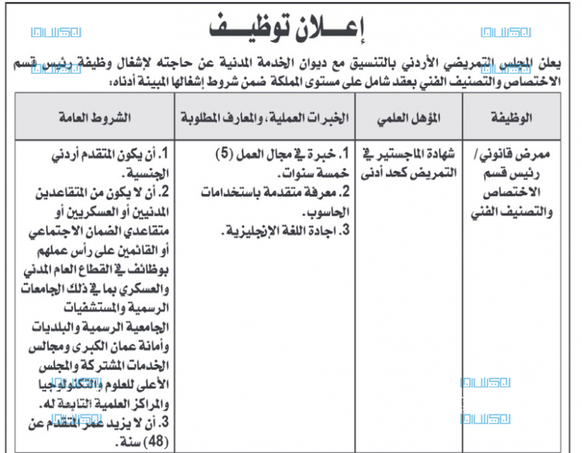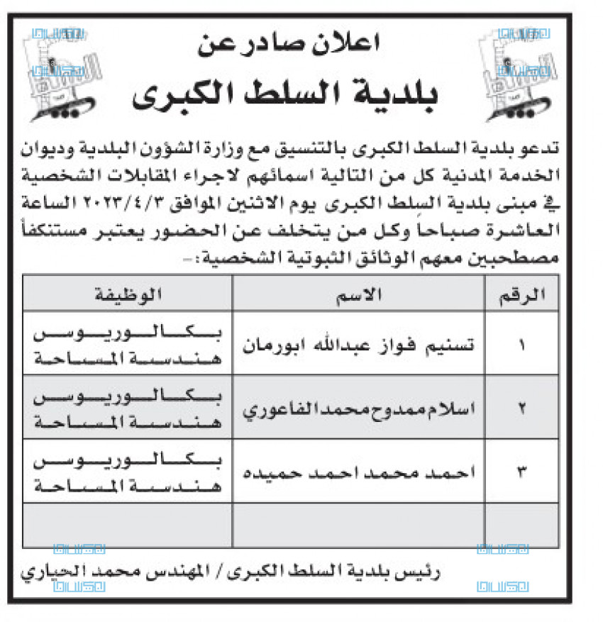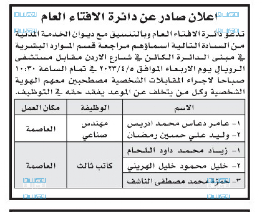نيسان ـ دعا ديوان الخدمة المدنية بالتنسيق مع عدد من الوزارات والمؤسسات الحكومية الأشخاص التالية لإجراء الاختبار التنافسي.