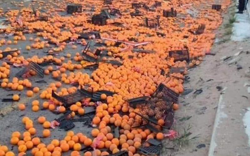نيسان ـ قال محافظ العقبة خالد الحجاج، إن إحدى مركبات الشحن المتوسطة "بنغو"، والتي كانت محملة بصناديق البرتقال تعرضت لحادث سير، مما أدى إلى سقوط وتناثر حبات البرتقال في الشارع العام.