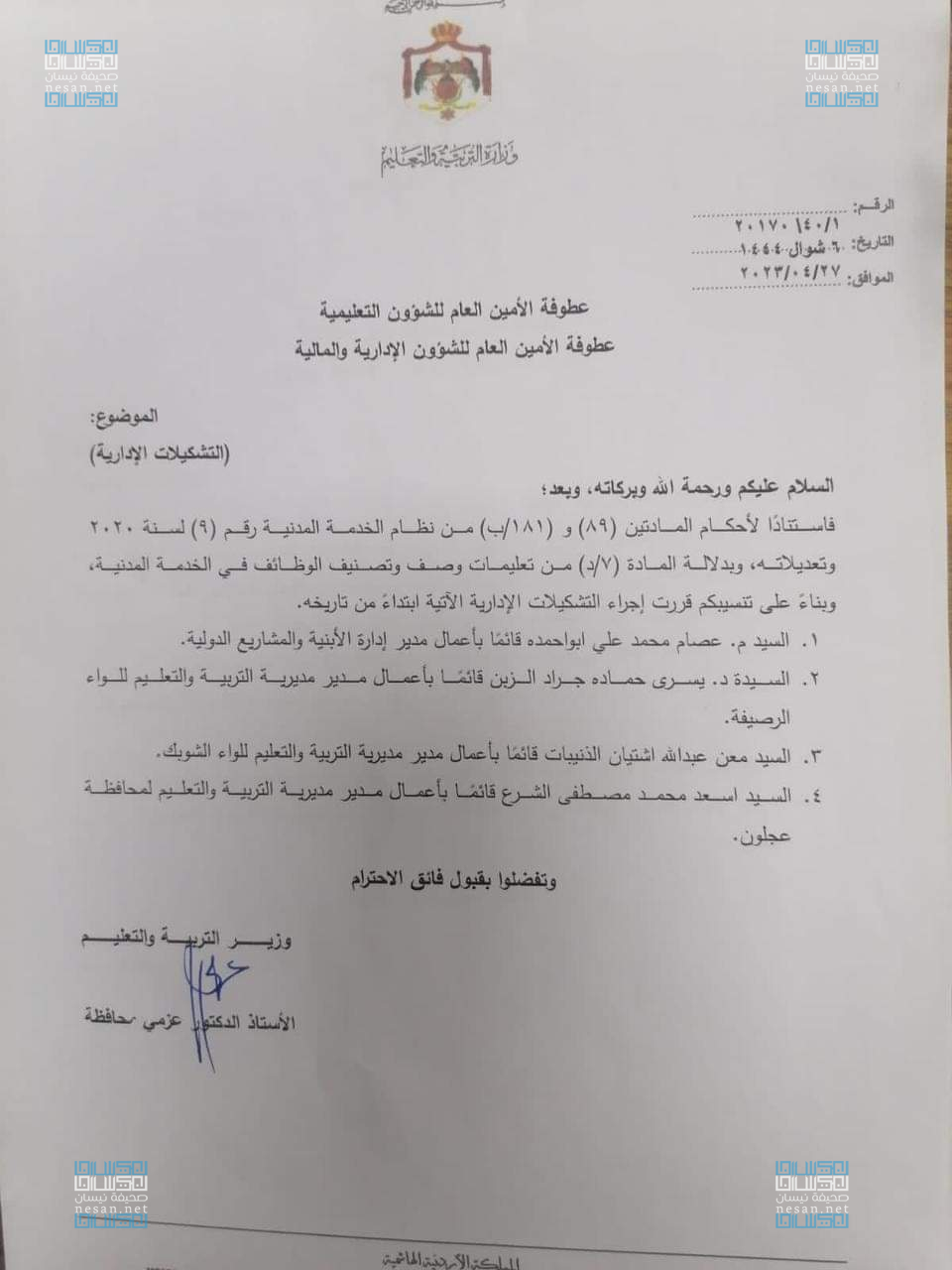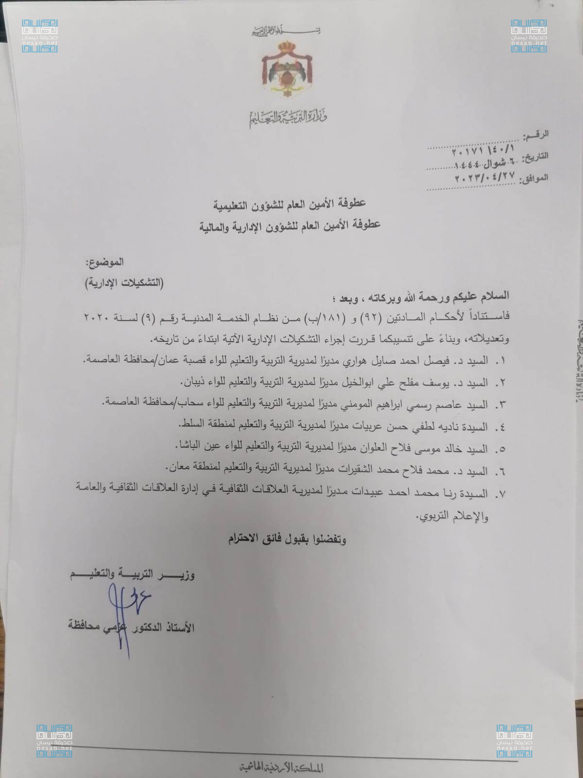 وزير التربية والتعليم يجري تشكيلات إدارية في محافظة تشمل مدير إدارة الأبنية والمشاريع الدولية ومدراء تربية.