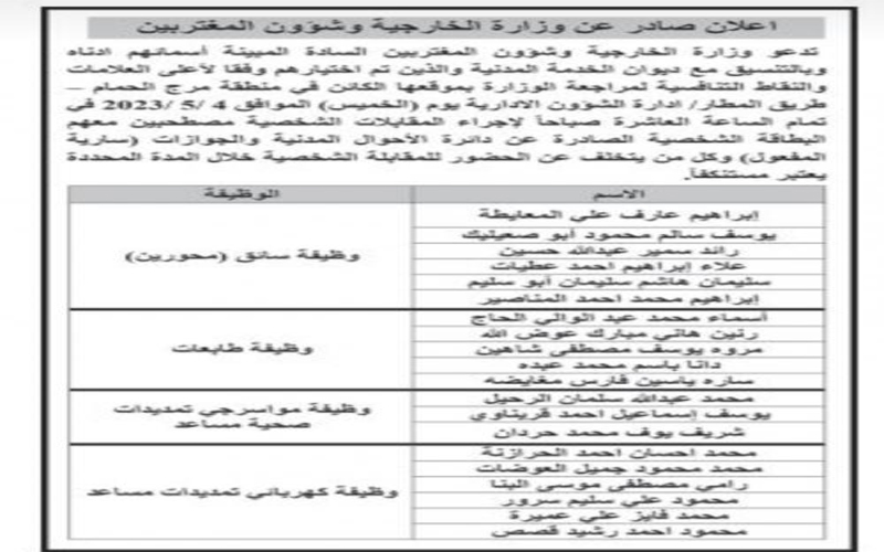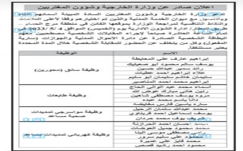 نيسان ـ دعت وزارة الخارجية وشؤون المغتربين بالتنسيق مع ديوان الخدمة المدنية، اليوم الإثنين عددا من المرشحين لإجراء المقابلات الشخصية.