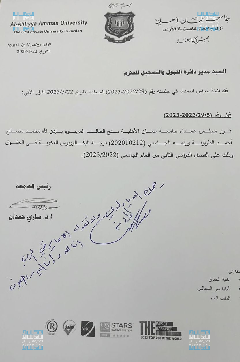 جامعة عمان الأهلية تمنح درجة البكالوريوس في الحقوق للطالب المرحوم محمد مصلح الطروانة بعد وفاته في حادث سير مؤسف.
