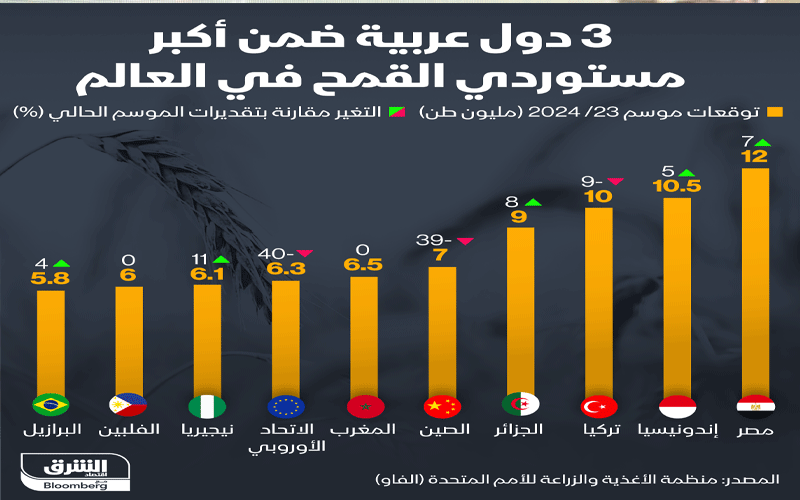 تتصدر مصر القائمة العالمية والعربية بـ12 مليون طن بزيادة متوقعة 7% في حجم الاستيراد مقارنة بالموسم الحالي، تليها الجزائر بـ9 ملايين طن بزيادة نسبتها 8% لتحتل المركز الثاني عربياً والرابع عالمياً، ثم المغرب في المركز الثالث عربياً والسادس عالمياً.بلومبرغ