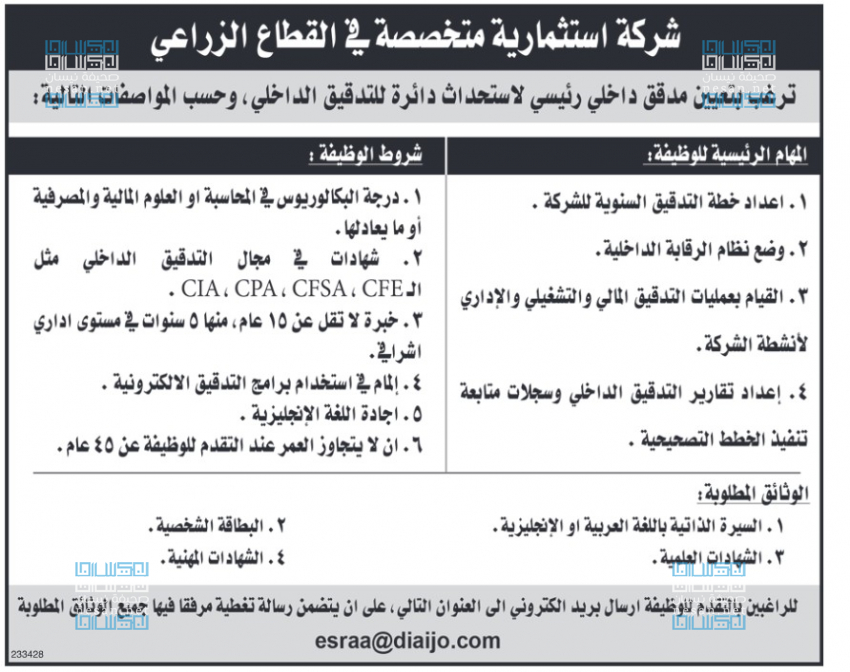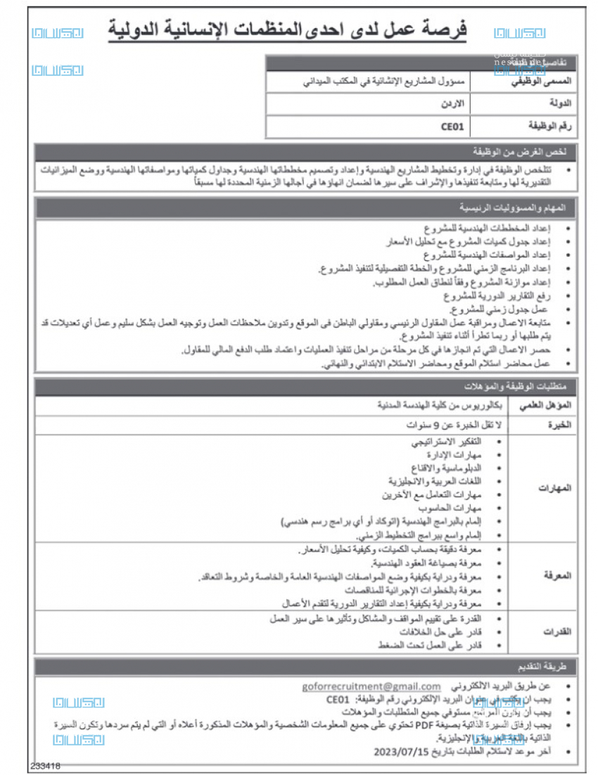 وأعلنت شركة استثمارية عن حاجتها لإشغال وظيفة مدقق داخلي، كما أعلنت منظمة إنسانية دولية حاجتها عن مسؤول المشاريع الانشائية.