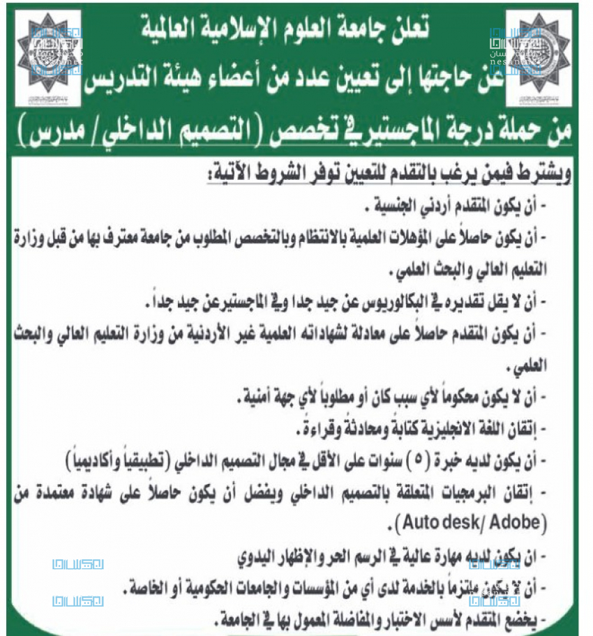 من جهتها أعلنت جامعة العلوم الإسلامية العالمية عن حاجتها لتعيين هيئة تدريسية من حملة الماجستير .