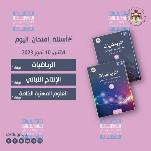 نيسان ـ نشرت وزارة التربية والتعليم، ظهر اليوم الإثنين، أسئلة امتحان مبحث الرياضيات لطلبة الثانوية العامة. وتاليا الأسئلة عبر المنشور الآتي :