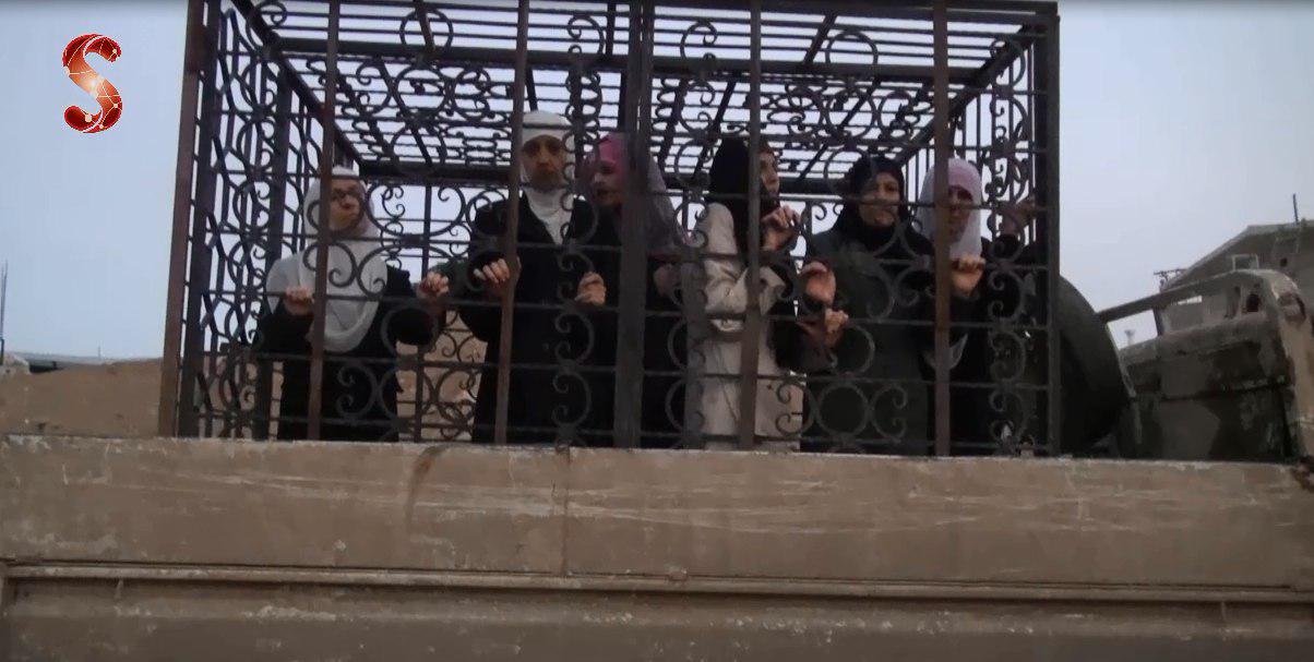 وأظهرت الصور نساء ضباط من مدينة القرداحة في ريف اللاذقية داخل الأقفاص التي تم نشرها في مدينة دوما في ريف دمشق.