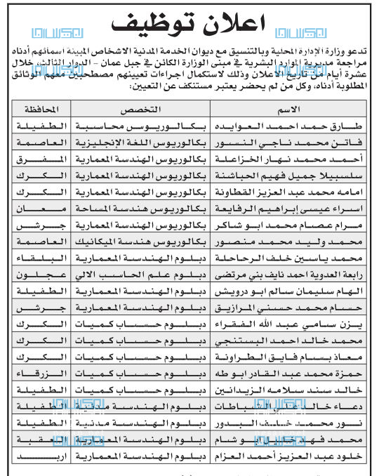 نيسان ـ دعت وزارة الإدارة المحلية والهيئة المستقلة للانتخاب اليوم الأحد، بالتنسيق مع ديوان الخدمة المدنية، عدداً من المرشحين مراجعتها لاستكمال إجراءات التعيين.