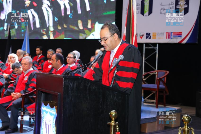 •وقد استهل الحفل بتلاوة عطرة من القران الكريم ، بعد السلام الملكي، ثم ألقى عميد شؤون الطلبة الدكتور مصطفى عطيات كلمة في الحفل حيّا فيها عطوفة الدكتور ماهر الحوراني رئيس هيئة المديرين ونائب رئيس مجلس الأمناء وعطوفة راعي الحفل الأستاذ الدكتور ساري حمدان رئيس الجامعة والسادة أصحاب المعالي والعطوفة والسعادة أعضاء مجلس أمناء الجامعة والسادة العمداء وأعضاء الهيئتين التدريسية والادارية ، و رحب بالضيوف والحضور ، والخريجين قائلا :