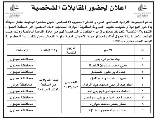 دعت وزارات ومؤسسات رسمية وبلديات بالتنسيق مع ديوان الخدمة المدنية اليوم الثلاثاء، مرشحين لإجراء المقابلات الشخصية واستكمال إجراءات التعيين.