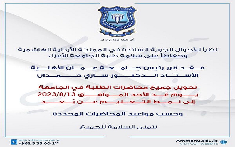 نيسان ـ قرر رئيس جامعة عمان الأهلية الأستاذ الدكتور ساري حمدان تحويل محاضرات الطلبة يوم غدٍ الأحد إلى نمط التعليم عن بعد، بحسب مواعيد المحاضرات المحددة.