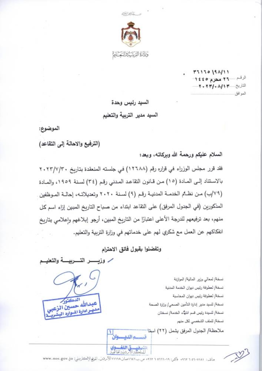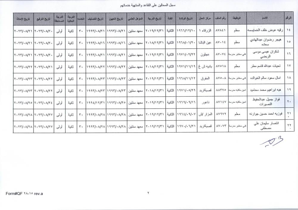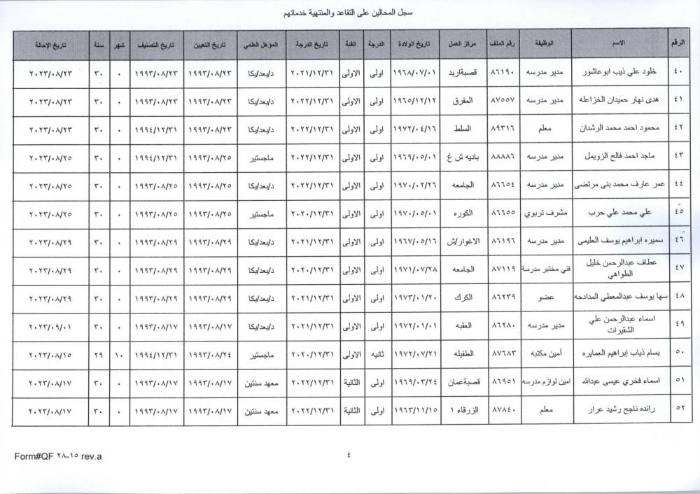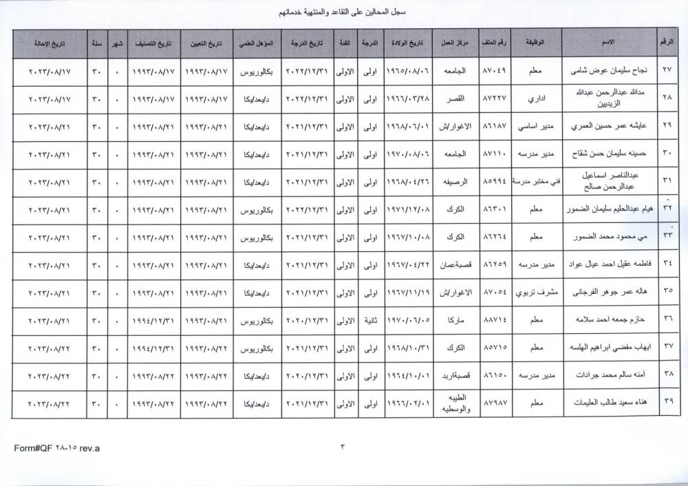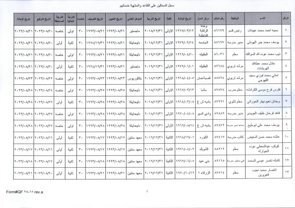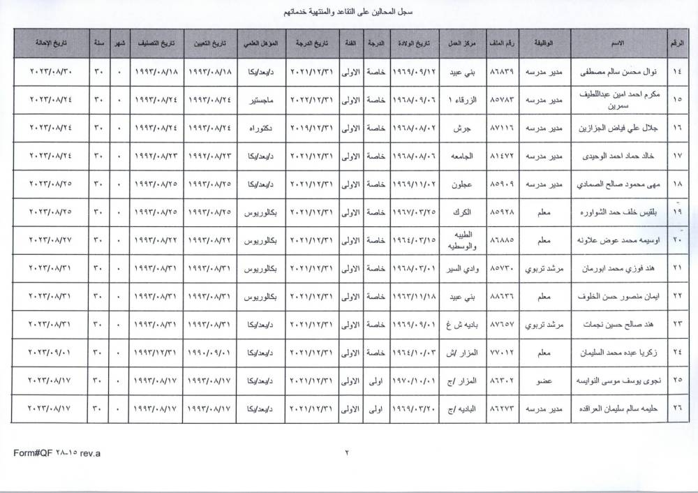 نيسان ـ قرر وزير التربية والتعليم، الدكتور عزمي محافظة اليوم الأحد، الموافقة على إحالة عدد من موظفي الوزارة إلى التقاعد.