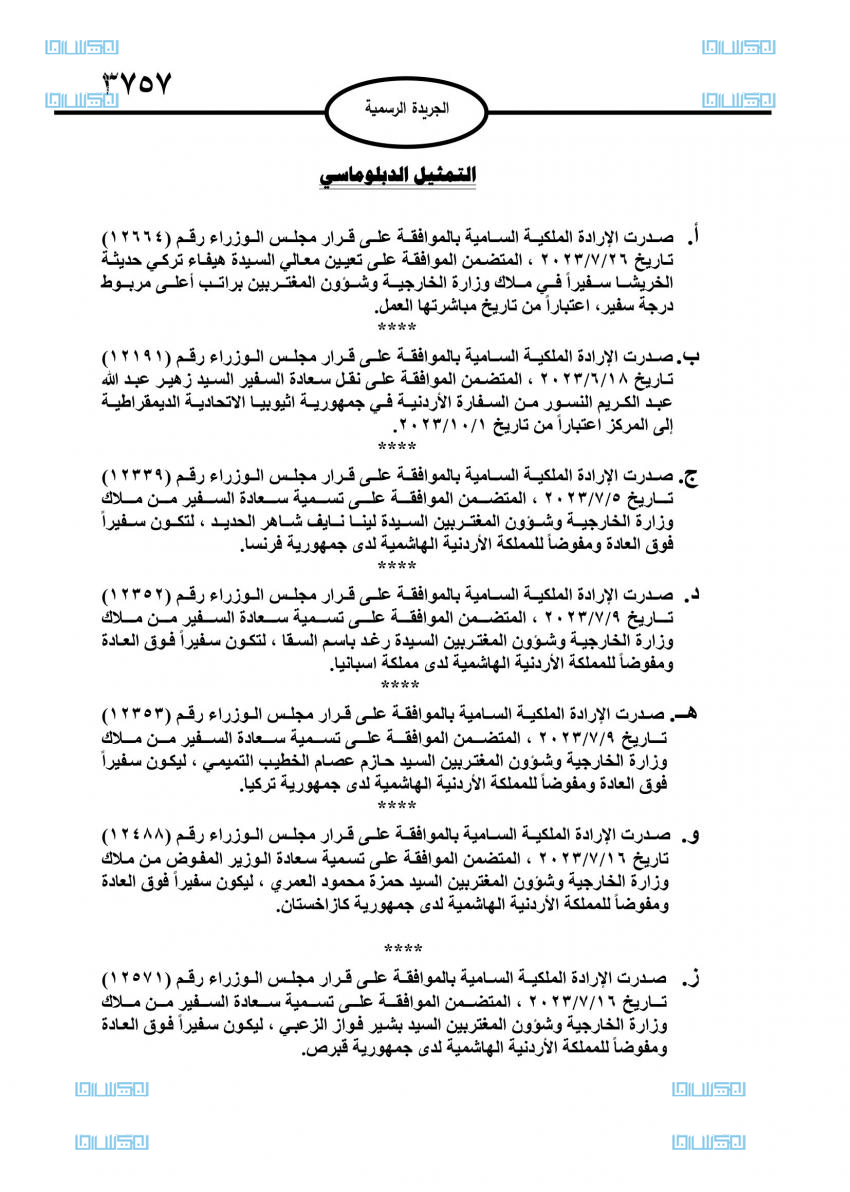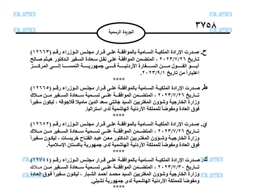 نيسان ـ صدر في عدد الجريدة الرسمية اليوم الاربعاء، الإرادات الملكية السامية بنقل وتسمية 10 سفراء.