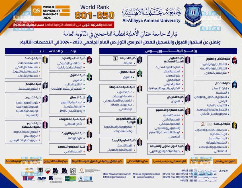 نيسان ـ تبارك جامعة عمان الأهلية للناجحين بالثانوية العامة وتعلن عن استمرار القبول والتسجيل للفصل الدراسي الأول من العام الجامعي 2023 - 2024 في التخصصات التالية :