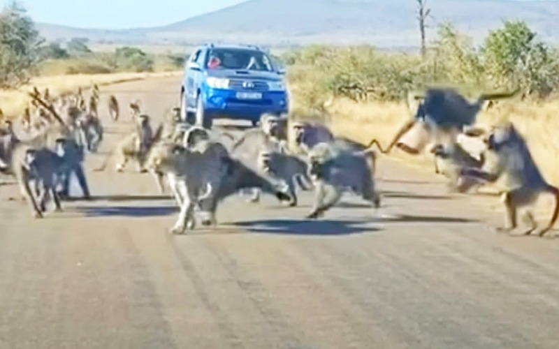 وتظهر في الفيديو قردة البابون التي تندفع بسرعة لإنقاذ القرد، وتقوم بمحاصرة الفهد، وعضه بقوة.