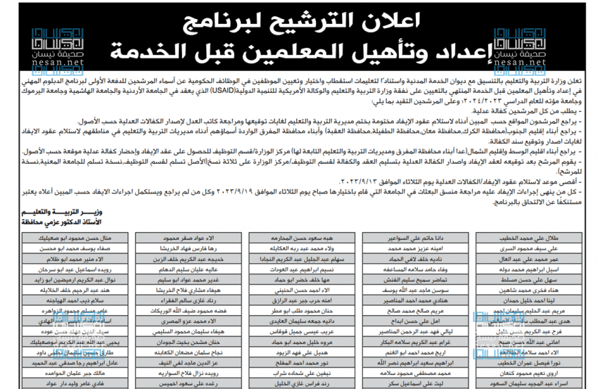 نيسان ـ أعلنت وزارة التربية والتعليم بالتنسيق مع ديوان الخدمة المدنية واستناداً لتعليمات استقطاب وأختيار وتعيين الموظفين في الوظائف الحكومية، عن أسماء المرشحين للدفعة الأولى لبرنامج الدبلوم المهني في إعداد وتأهيل المعلمين قبل الخدمة المنتهي بالتعيين على نفقة وزارة التربية والتعليم والوكالة الأمريكية للتنمية الدولية (USAID) الذي يعقد في الجامعة الأردنية والجامعة الهاشمية وجامعة اليرموك وجامعة مؤته للعام الدراسي 2023-2024 .