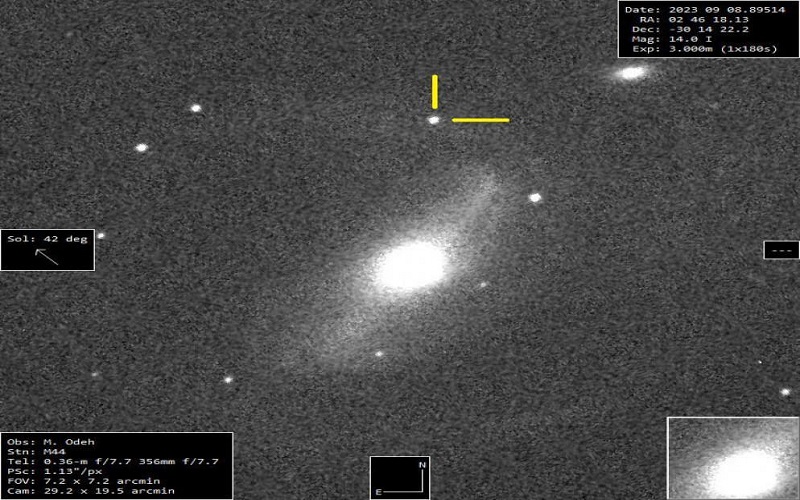 نيسان ـ اكتشف مدير مركز الفلك الدولي وعضو الجمعية الفلكية الأردنية محمد شوكت عودة نجما متفجرا (سوبرنوفا) جديد مساء الجمعة الماضي الموافق 8 أيلول 2023 بعد تسعة أشهر من الرصد المستمر في مرصد الختم الفلكي في أبوظبي في مجرة NGC 1097 ( كالدويل 67).