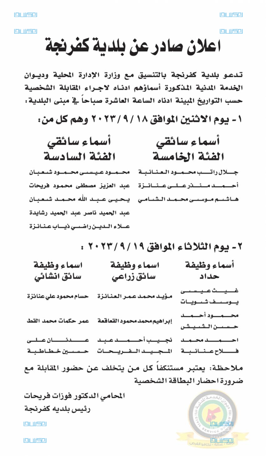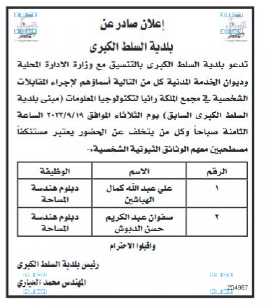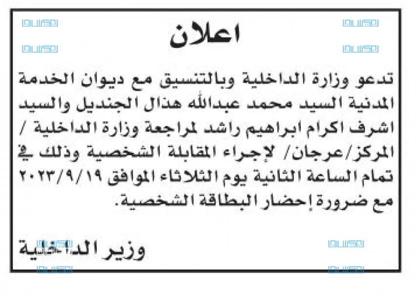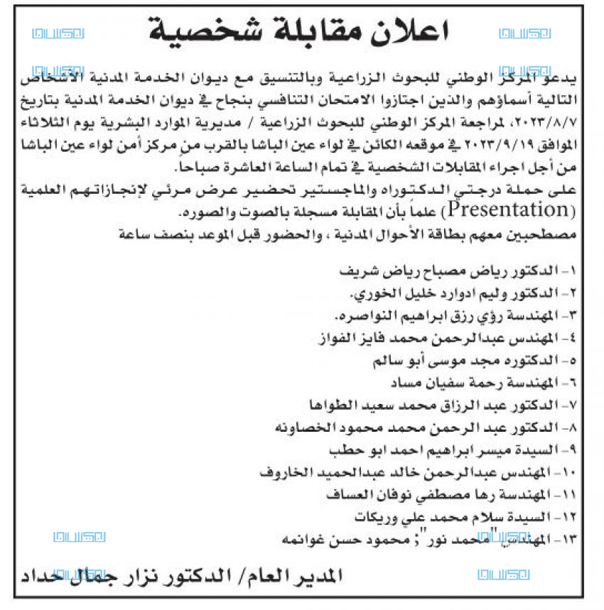 نيسان ـ دعا ديوان الخدمة المدنية المرشحين المدرجة أسماؤهم أدناه لإجراء الامتحان التنافسي الالكتروني في عدة وزارات ومؤسسات حكومية .