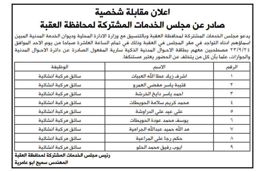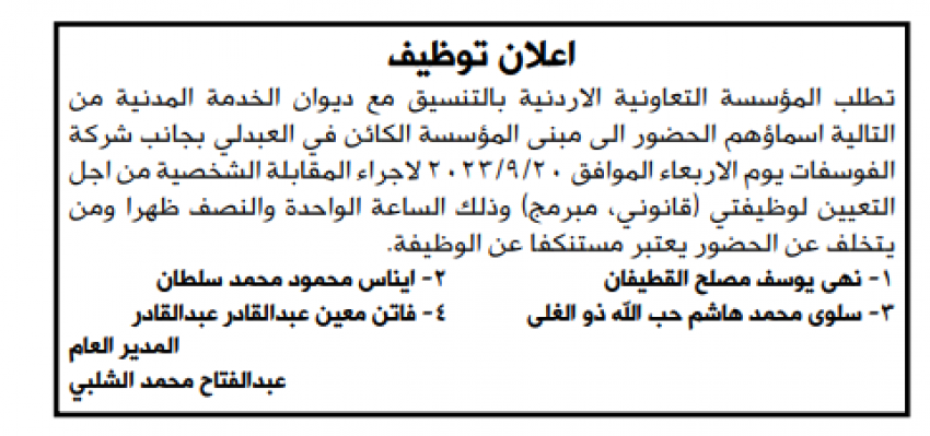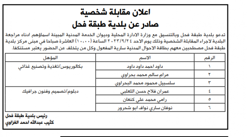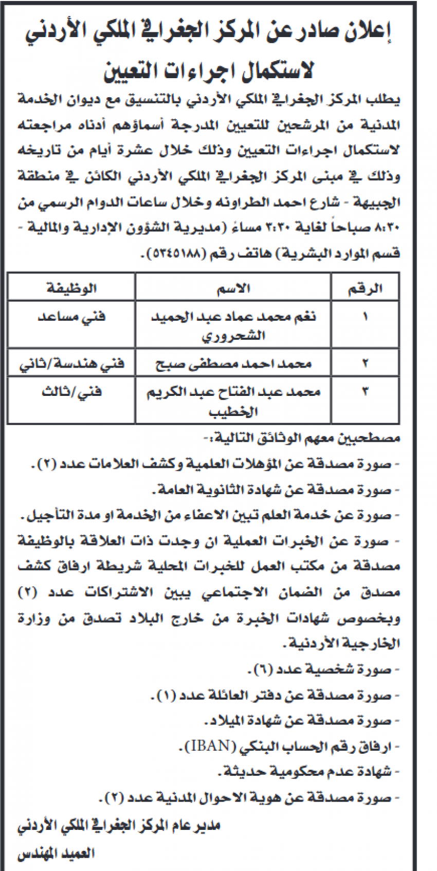 نيسان ـ دعا ديوان الخدمة المدنية بالتنسيق مع عدد من الوزارات والمؤسسات الحكومية الأشخاص التالية لإجراء المقابلات الشخصية ولاستكمال إجراءات التعيين.