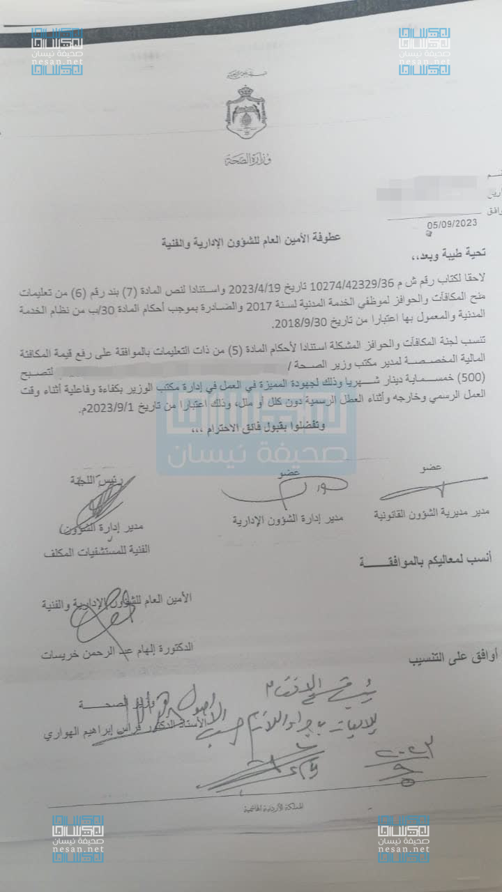 نيسان ـ نسبت لجنة المكافآت والحوافز في وزارة الصحة برفع مكافأة مدير مكتب الوزير لتصل إلى 500 دينار شهري.