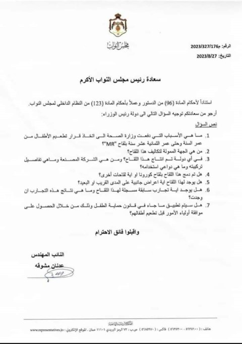 نيسان ـ وجه النائب عدنان مشوقه سؤالا نيابيا إلى وزارة الصحة، حول الأسباب التي دفعت الوزارة الى اتخاذ قرار تطعيم الاطفال بلقاح ( mr).