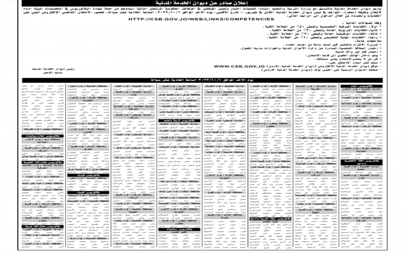 نيسان ـ دعا ديوان الخدمة المدنية بالتنسيق مع وزارة التربية والتعليم استنادًا لتعليمات اختيار وتعيين الموظفين في الوظائف الحكومية، المرشحين ادناه لإجراء الامتحان التنافسي.