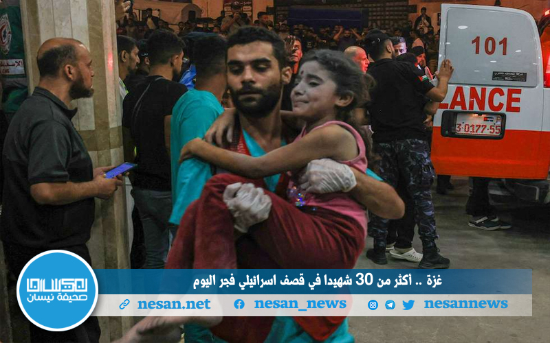 نيسان ـ أعلنت مصادر طبية ومحلية فلسطينية، عن استشهاد أكثر من 30 فلسطينيا، فجر الأربعاء، في قصف مدفعي وجوي وبحري إسرائيلي متواصل على مختلف مناطق قطاع غزة المحاصر.